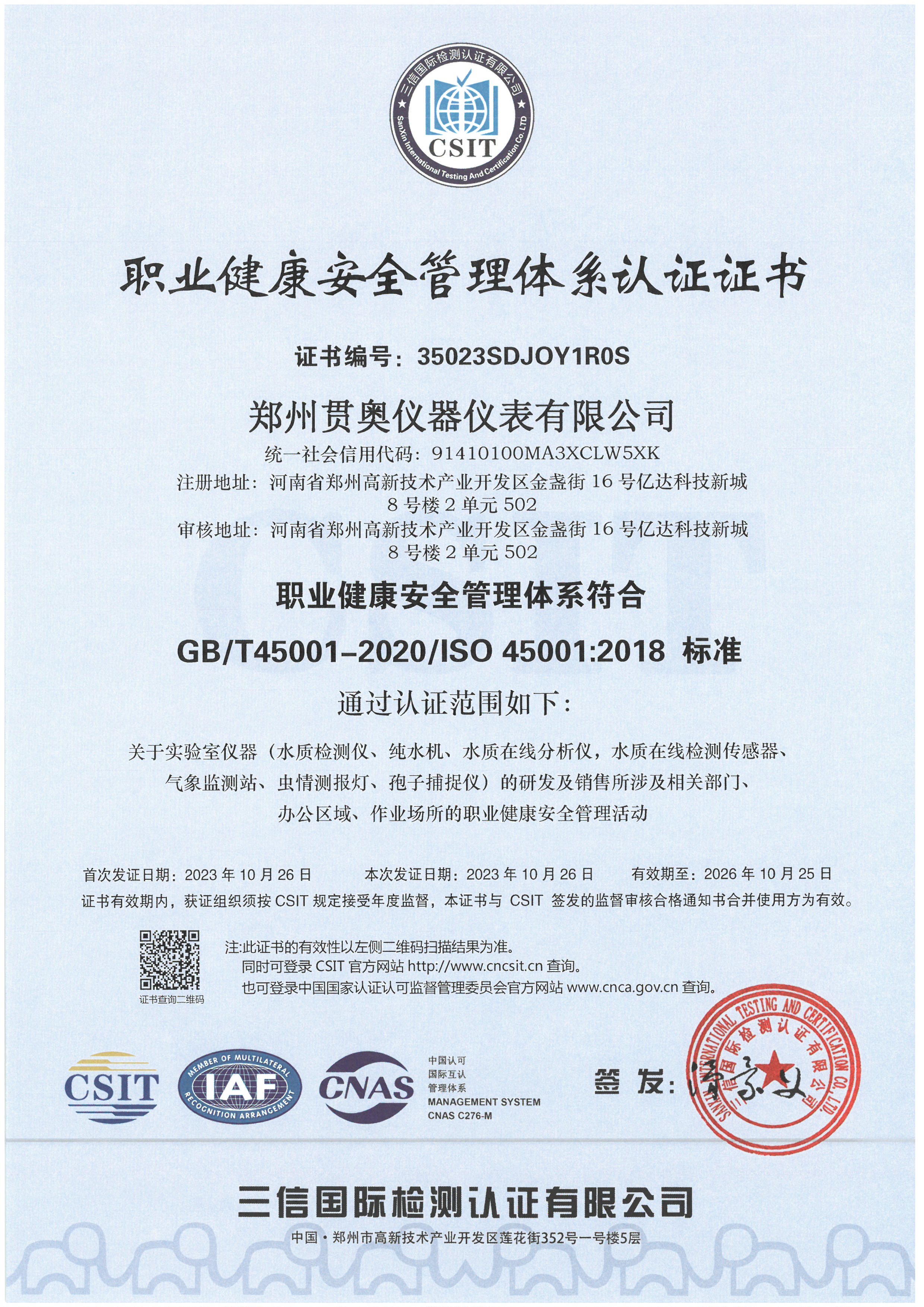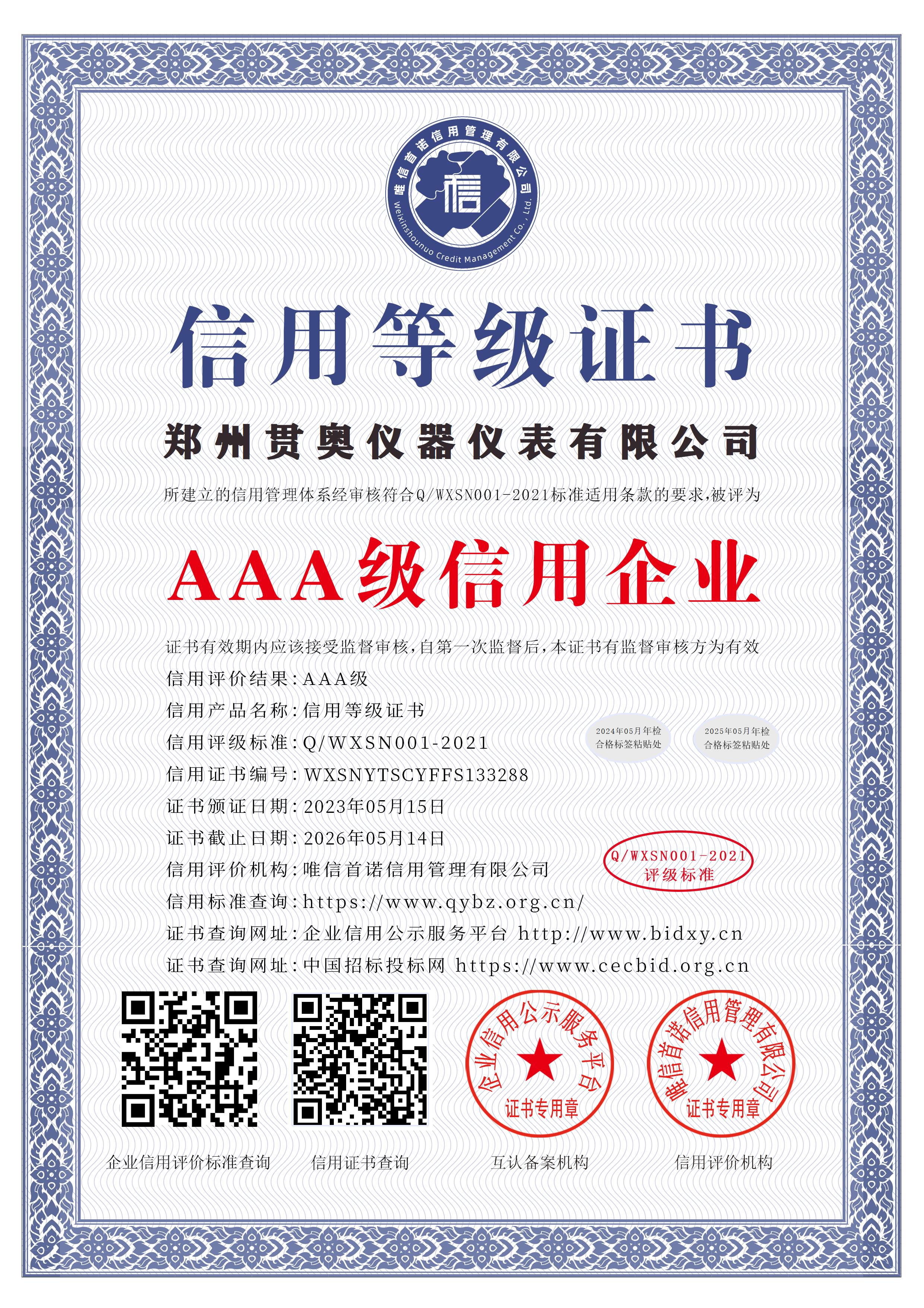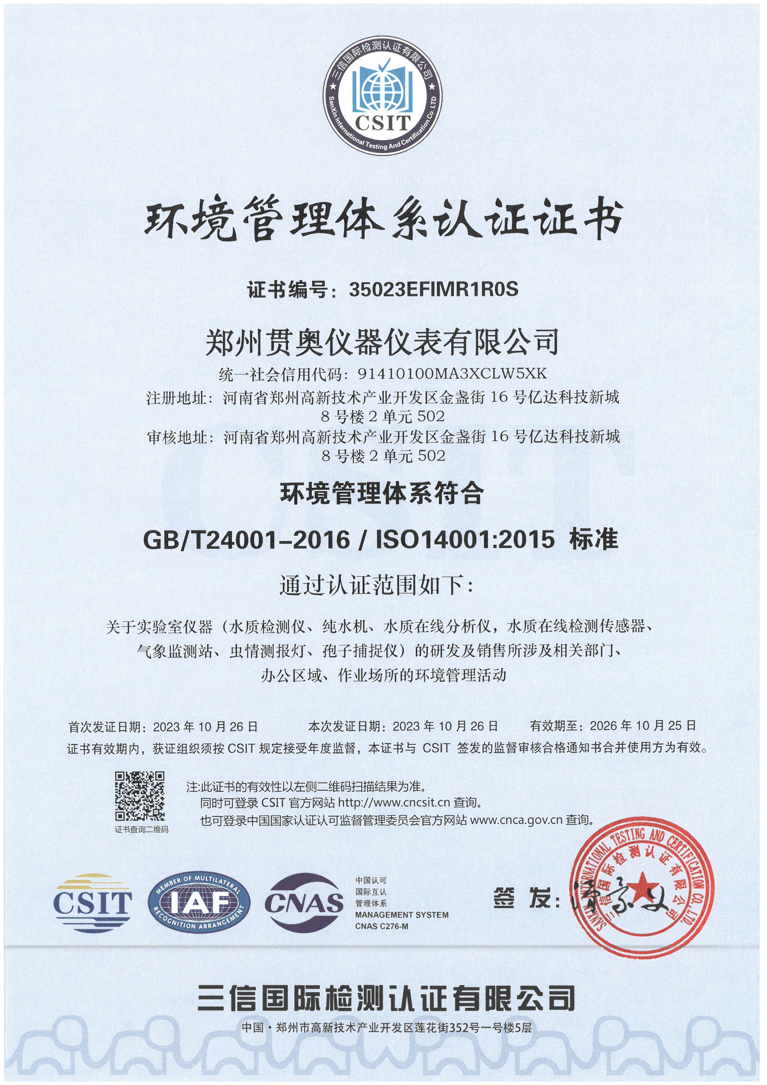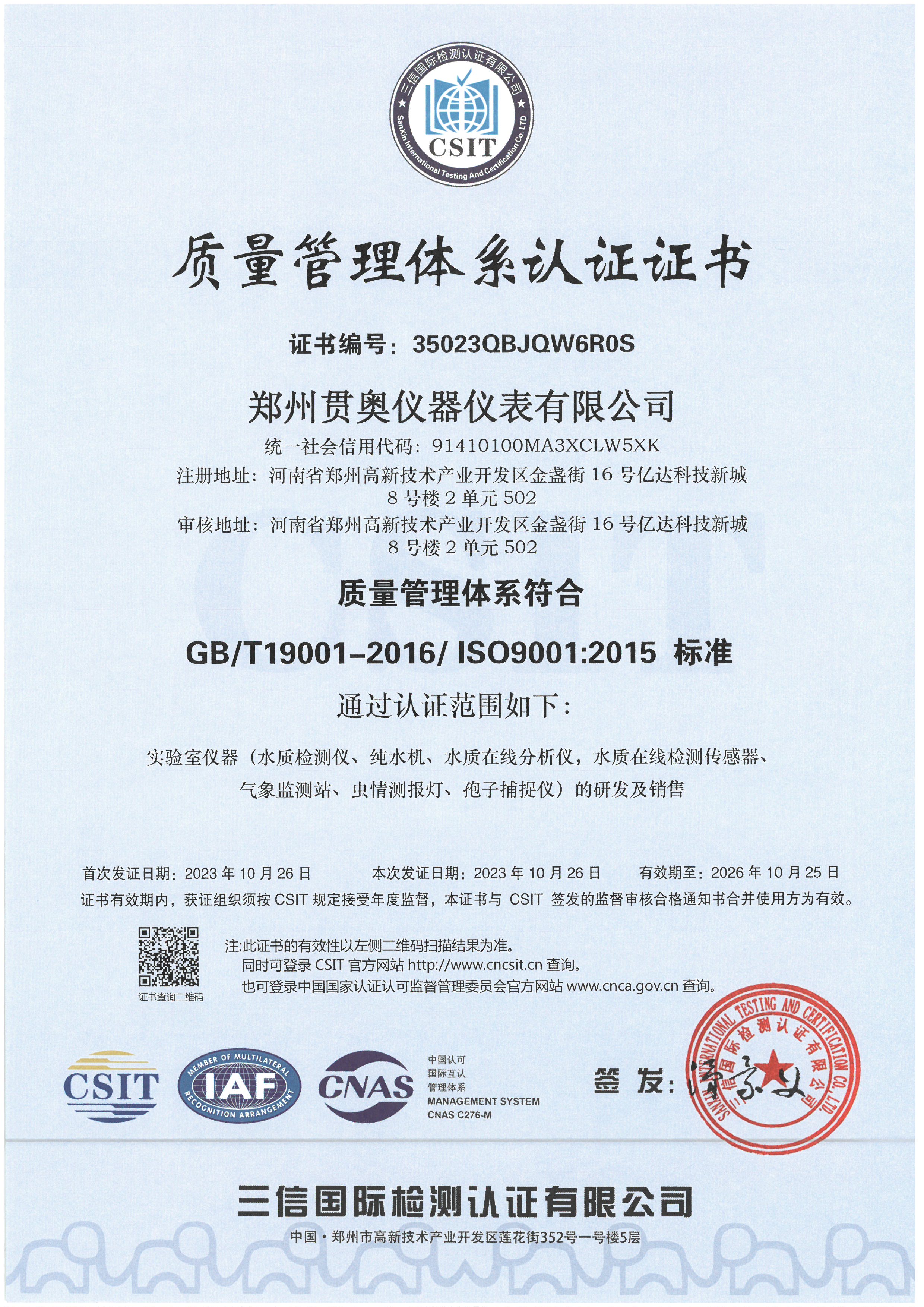貫奧儀器位于鄭州(zhou)高新(xin)技(ji)(ji)術(shu)(shu)產(chan)(chan)業開發區,是高新(xin)技(ji)(ji)術(shu)(shu)企業、行業AAA級(ji)信用(yong)企業,已通(tong)過GB/T19001:2016質量管理體(ti)系(xi)認(ren)證、GB/T24001:2016環境(jing)管理體(ti)系(xi)認(ren)證和GB/T45001:2020職業健康安全管理體(ti)系(xi)認(ren)證,擁有(you)多(duo)項證書,產(chan)(chan)品已通(tong)過河南省電子信息產(chan)(chan)品質量監督檢驗院檢測,并出具了相關檢驗報告(gao),我們以雄厚的(de)(de)(de)研發實(shi)力、過硬的(de)(de)(de)產(chan)(chan)品質量、完善的(de)(de)(de)售后服(fu)務為客戶提供分(fen)析(xi)檢測技(ji)(ji)術(shu)(shu)解決方(fang)案,擁有(you)過硬的(de)(de)(de)分(fen)析(xi)儀器生產(chan)(chan)技(ji)(ji)術(shu)(shu)和整體(ti)的(de)(de)(de)水質監測解決方(fang)案。