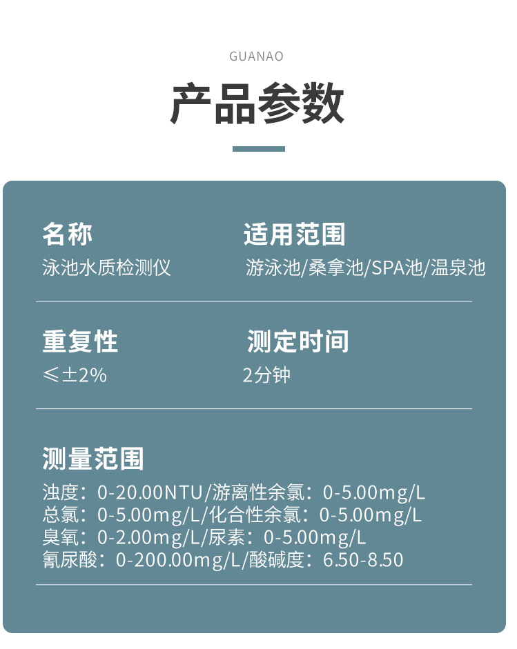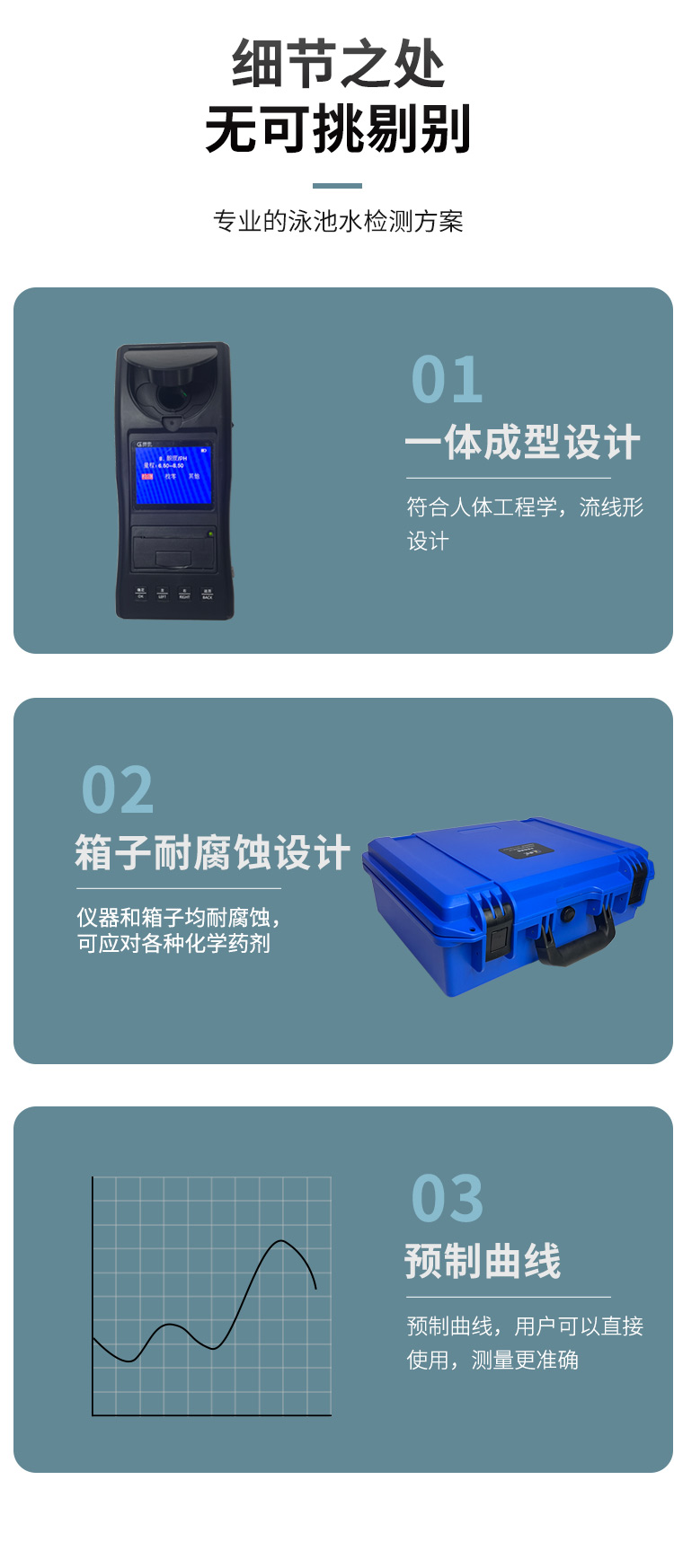 1、相比于傳統的試劑試紙測(ce)(ce)定,貫奧泳(yong)池水(shui)質檢(jian)(jian)測(ce)(ce)箱的檢(jian)(jian)測(ce)(ce)數據更(geng)準(zhun)確,檢(jian)(jian)測(ce)(ce)速度更(geng)快。